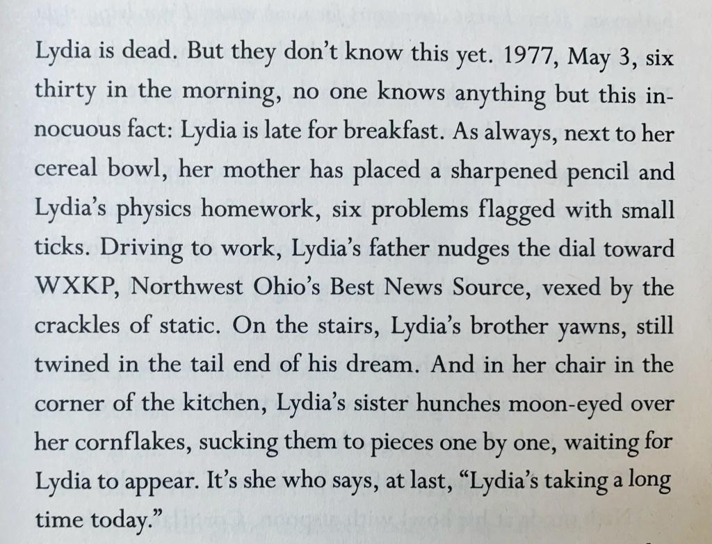 6. The “before”: In classic story structure, an author provides a glimpse of what the characters’ lives look like before an inciting incident which shifts them into a new world / new situation. This paragraph gives an example of the status quo: for these characters who don’t know of Lydia’s death, this is their typical morning routine. By leading off with “Lydia is dead. But they don’t know this yet,” Ng ensures that we’re not bored by reading about what the daughter does with her cereal, for instance. We know their worlds will be disrupted, any second.