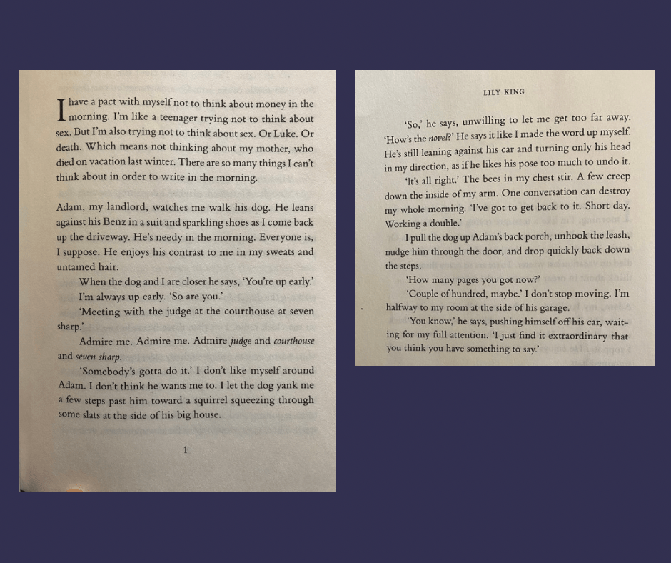 Still, this is a “quiet” book club novel. There is no murder to be solved, no killer on the loose, no race against the clock to save the world from destruction. So how does King so effectively draw her readers in, from the opening page?